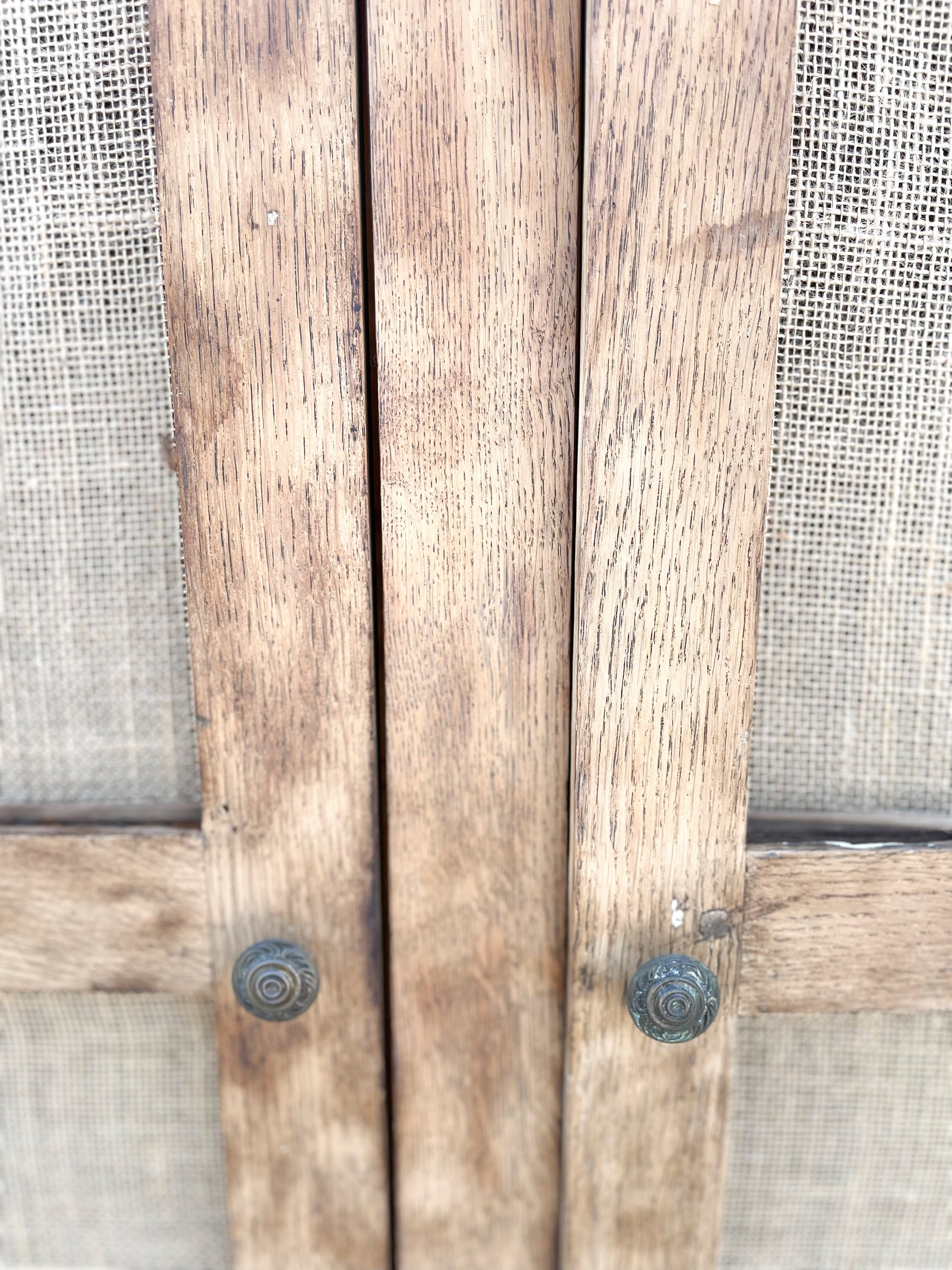 Authentique, naturelle et pleine de charme : cette armoire vintage en bois brut décapé et toile de jute est une véritable pépite pour les amoureux de mobilier de caractère.