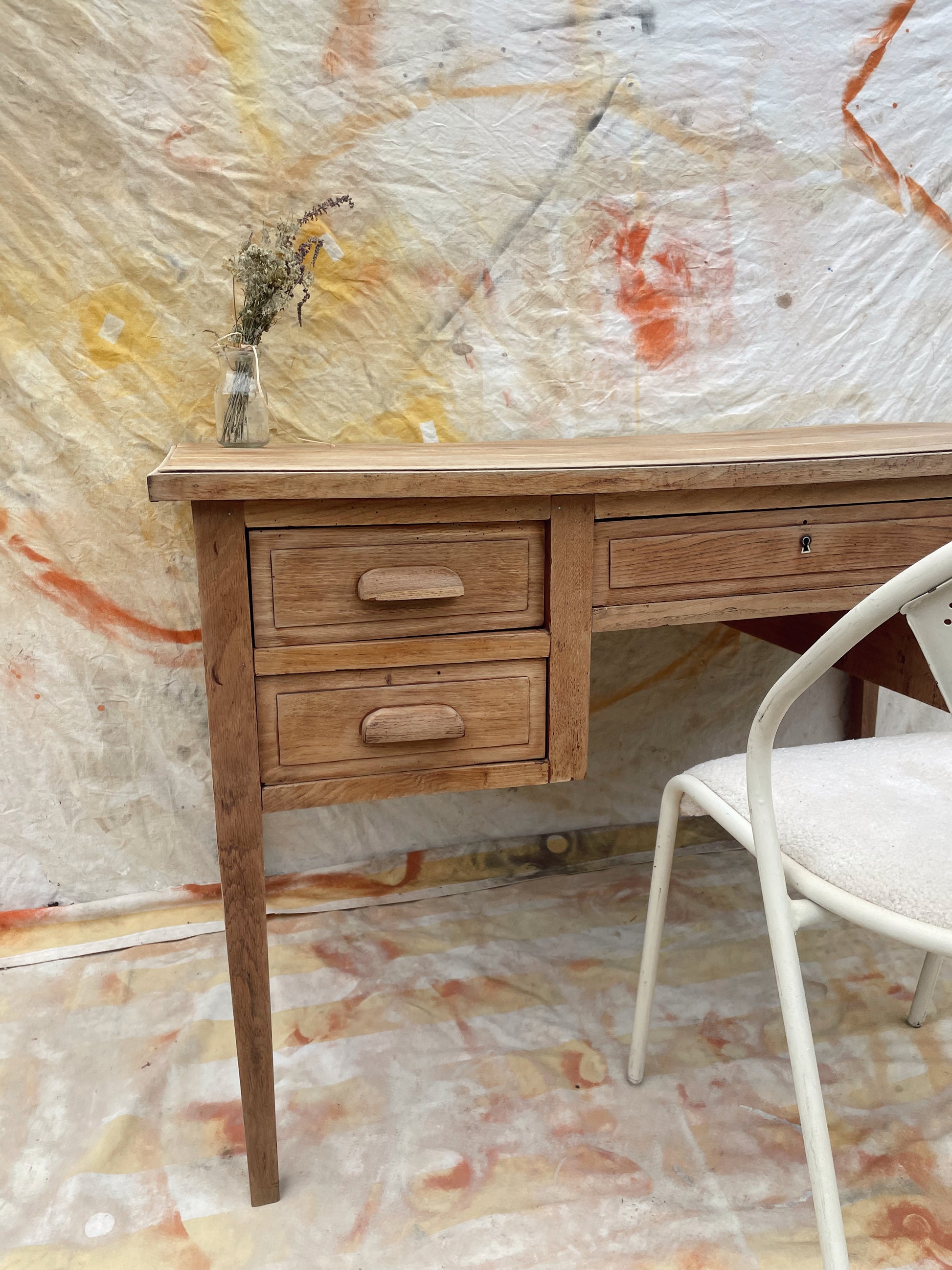 Un bureau plein de charme, entièrement décapé pour révéler une belle patine claire et naturelle, aux nuances douces et chaleureuses.