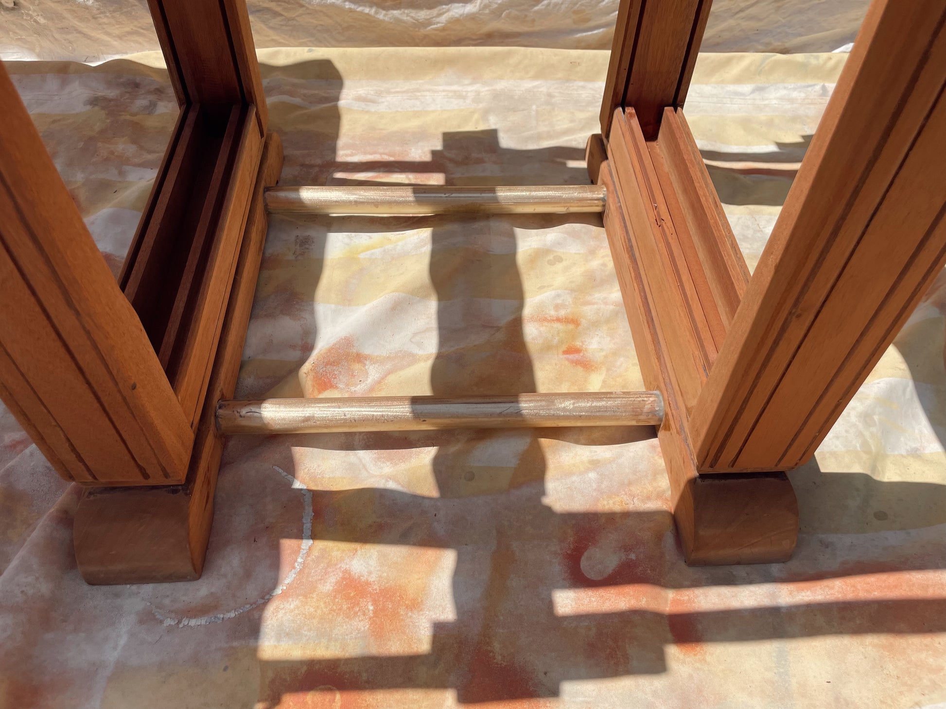 • Piètement central à colonnes jumelées, stabilisé par des barres en bois tourné