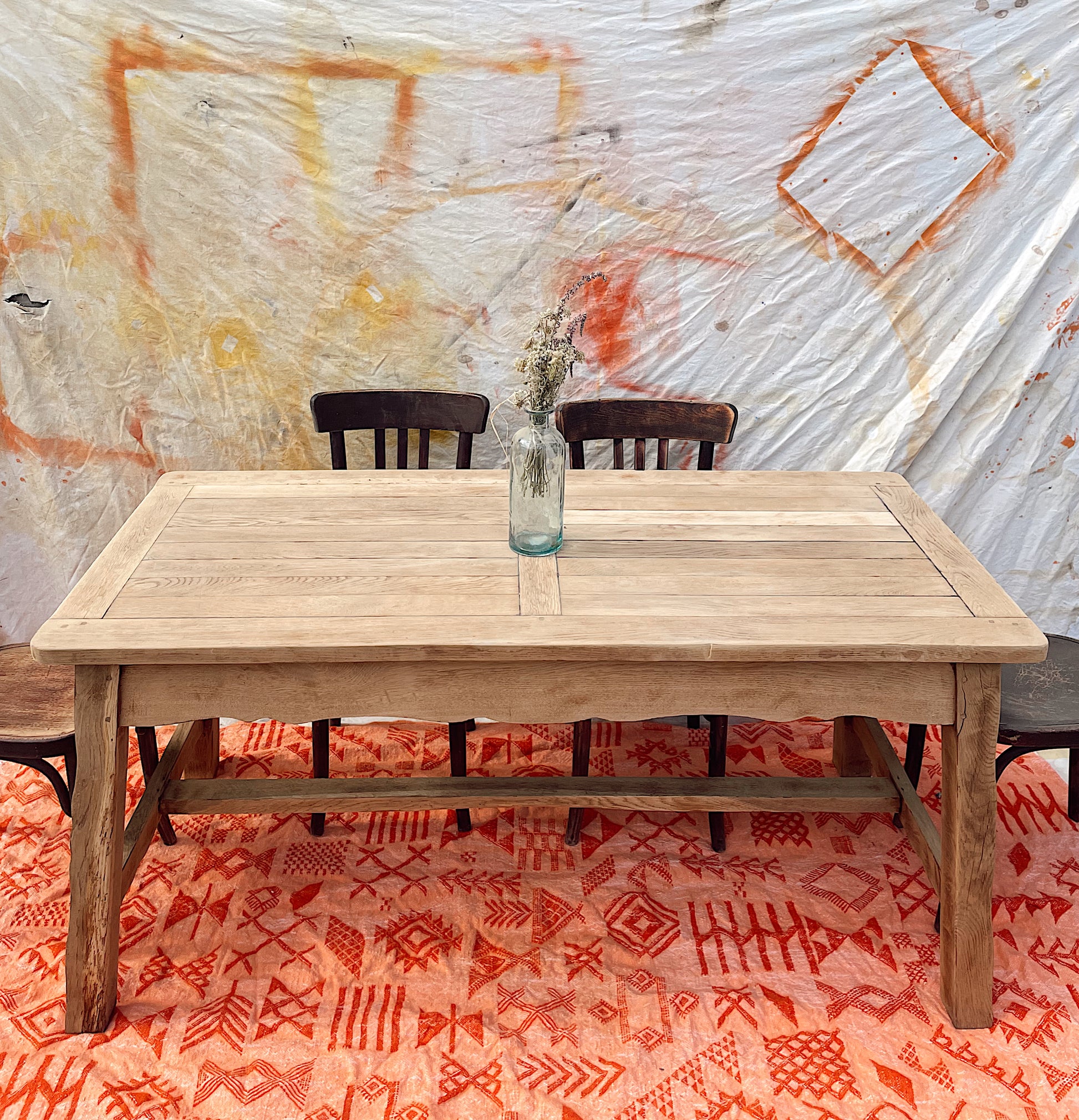Entièrement décapée et laissée dans une teinte naturelle claire, elle met en valeur le veinage du chêne et la douceur du bois brut.