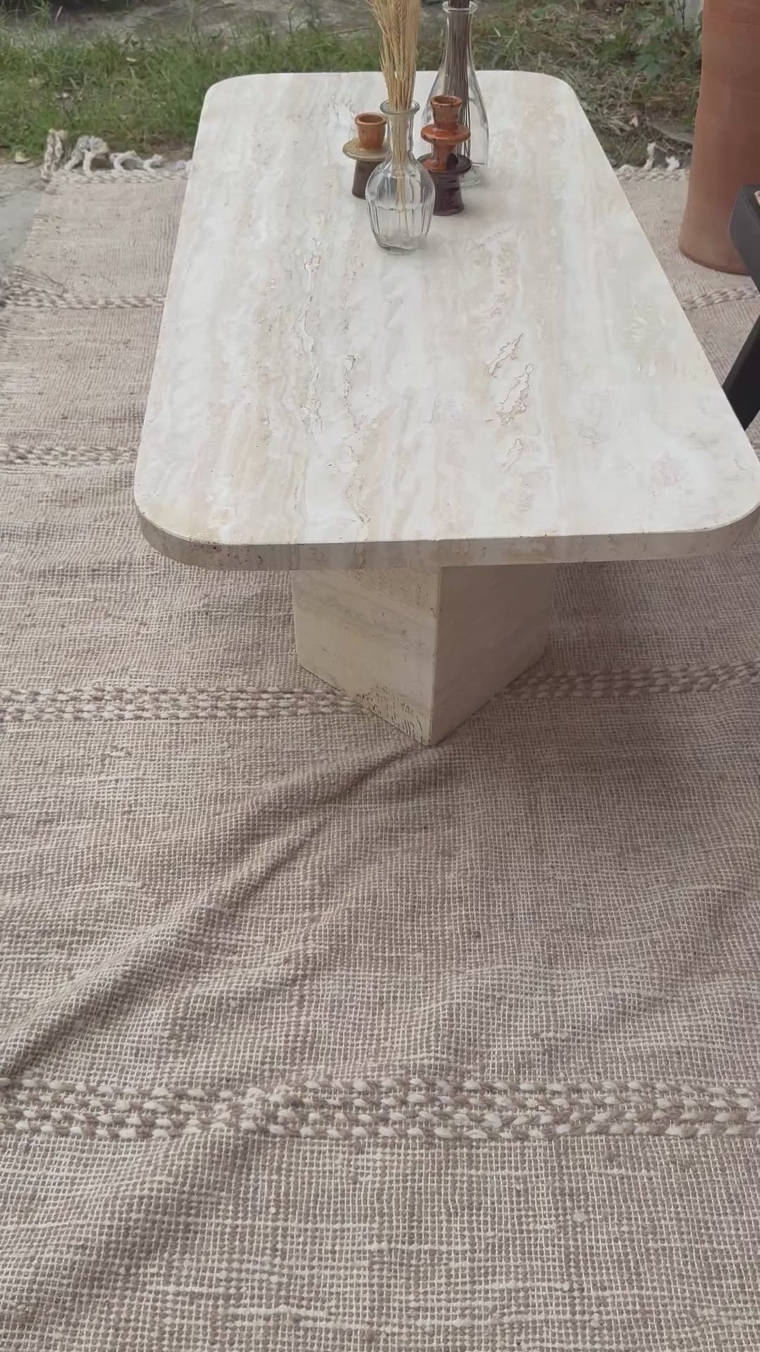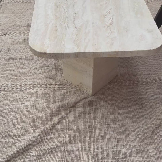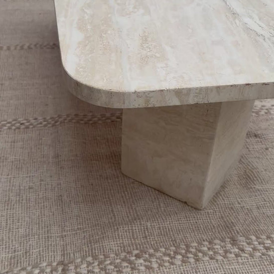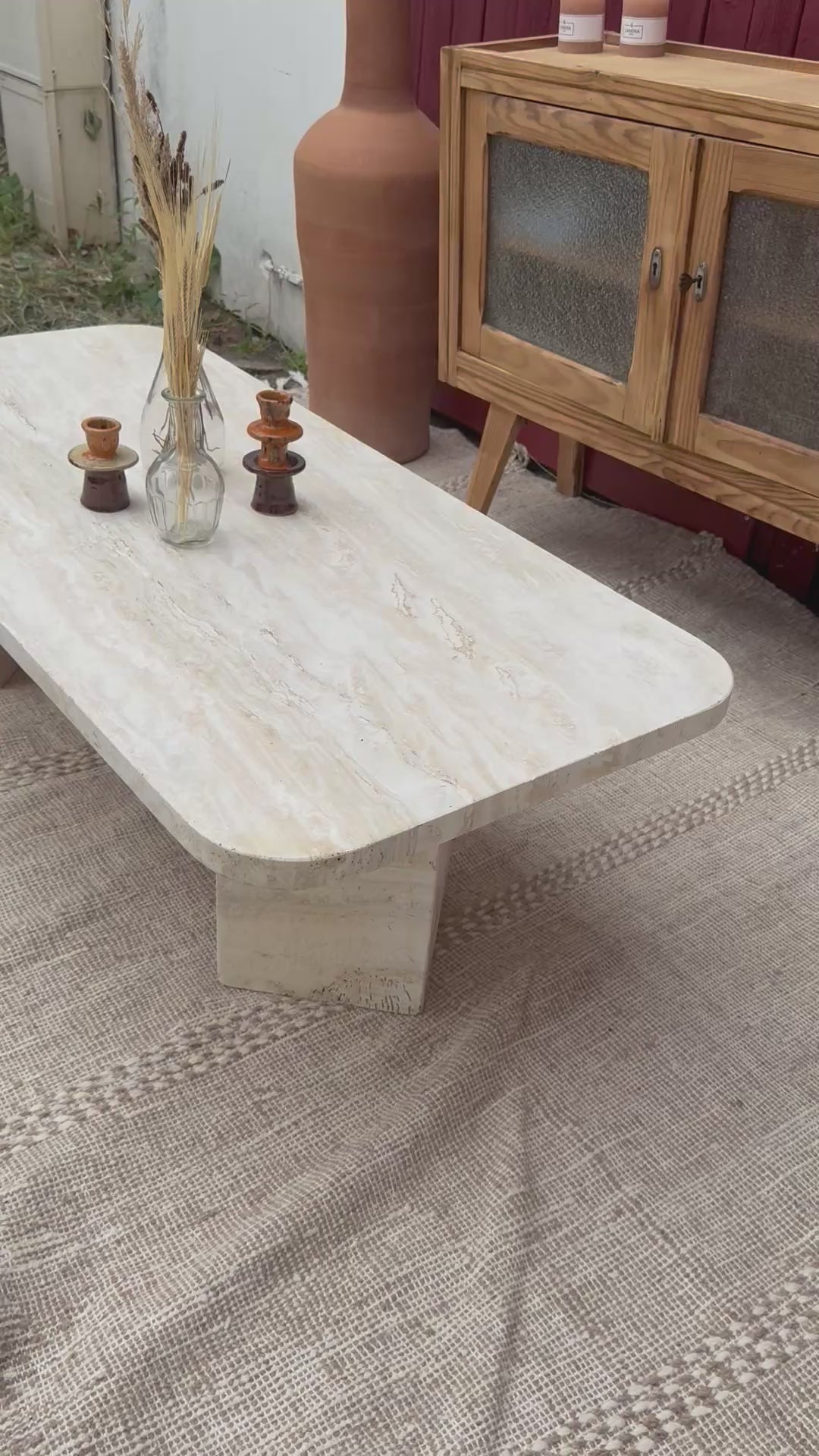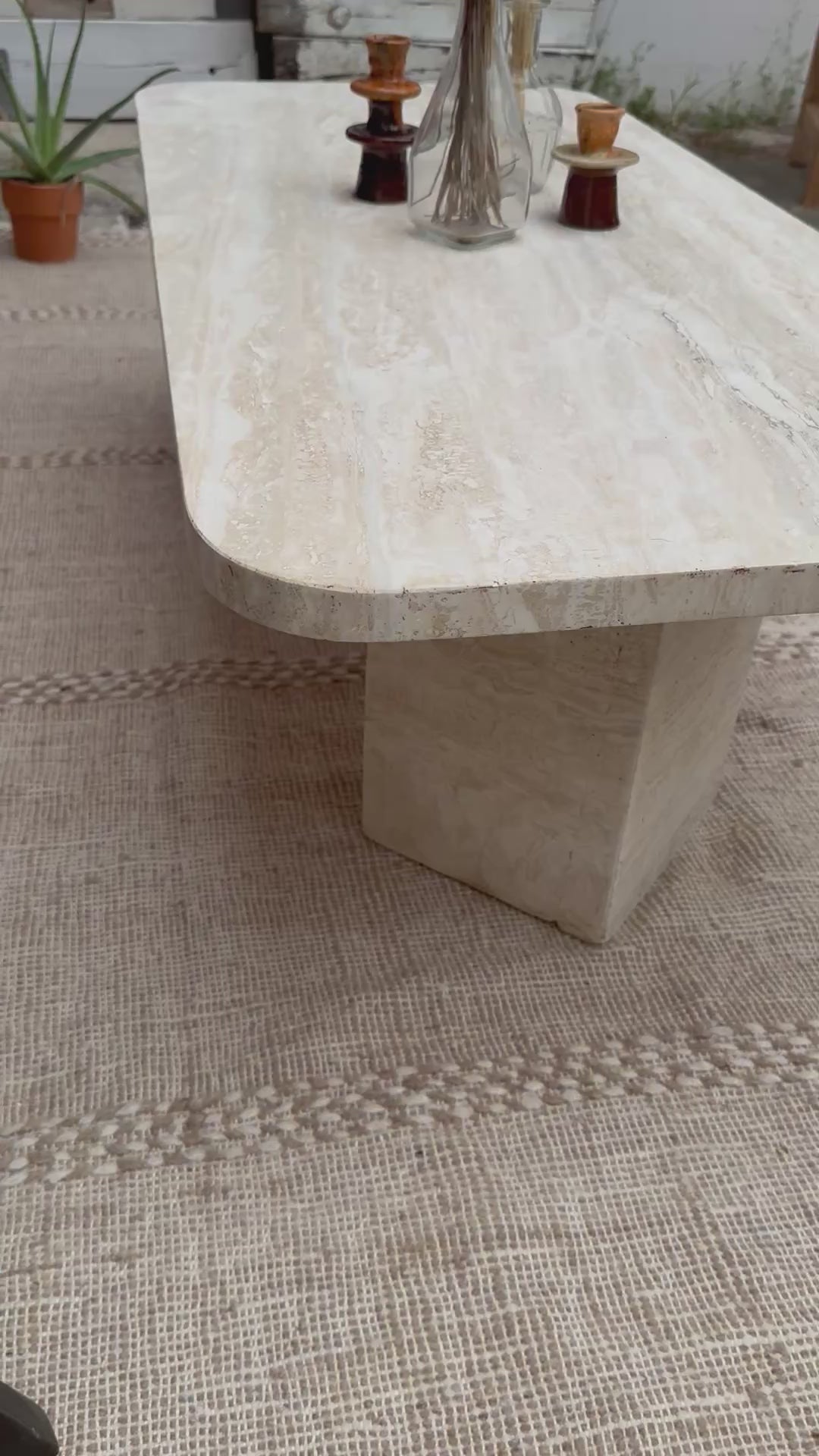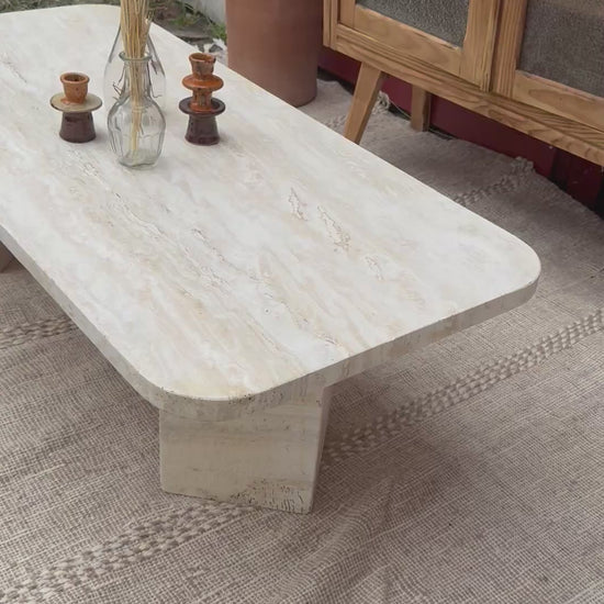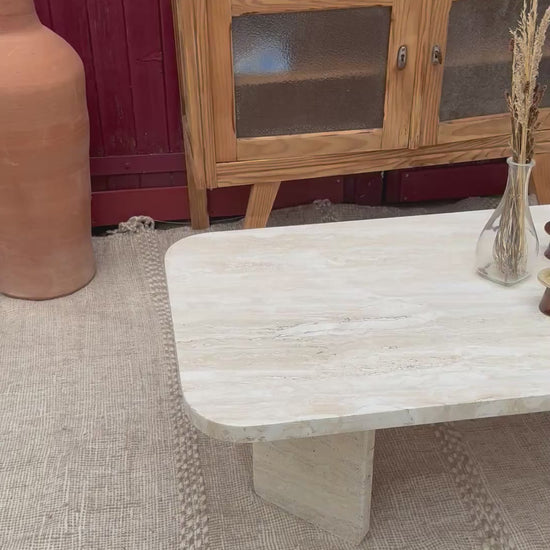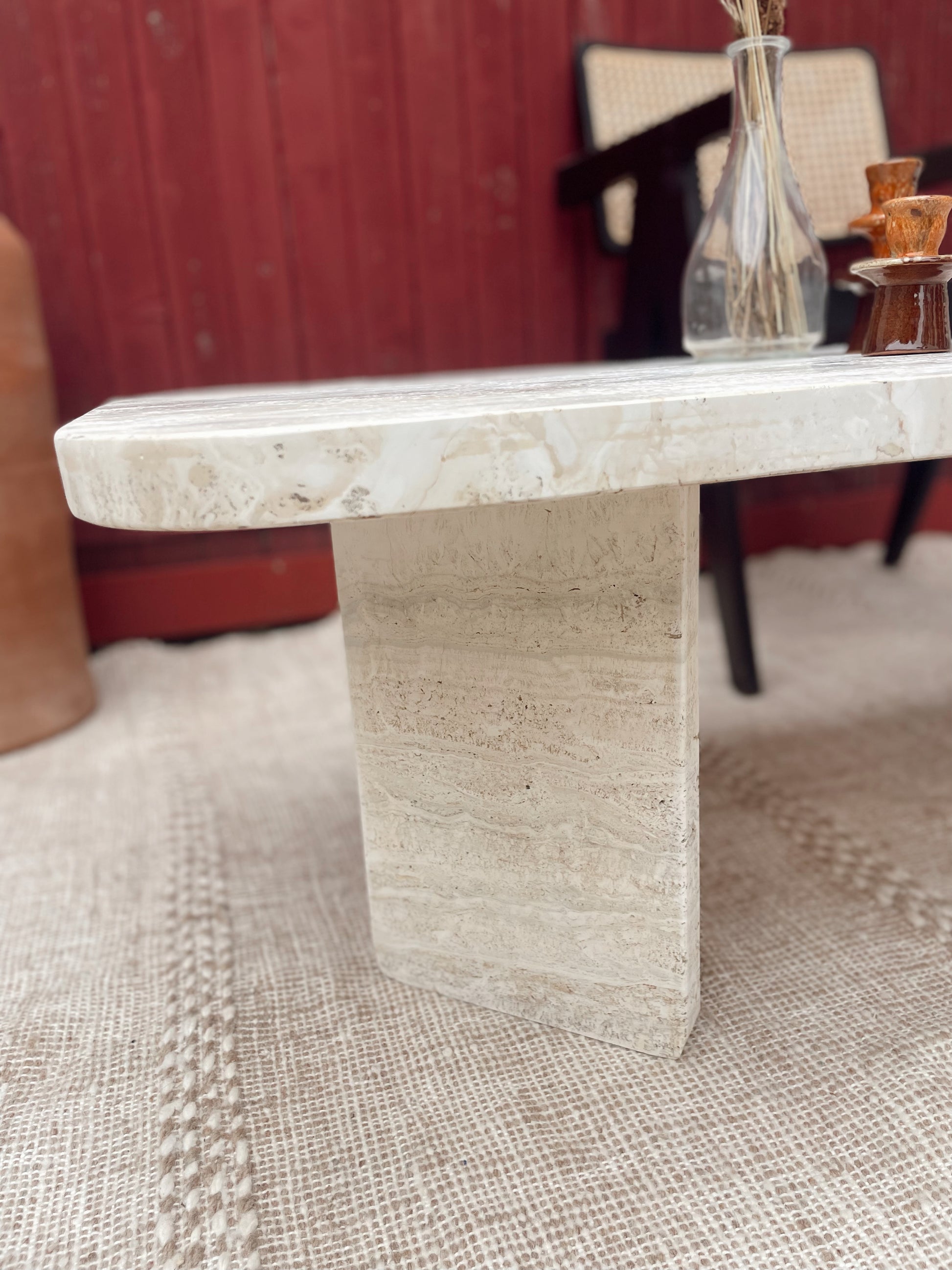 Cette élégante table basse en travertin se distingue par la beauté de sa pierre naturelle aux nuances douces, oscillant entre beige clair et veinures crème. Son plateau rectangulaire aux bords adoucis repose sur deux pieds massifs en travertin, offrant à la fois stabilité et présence visuelle.